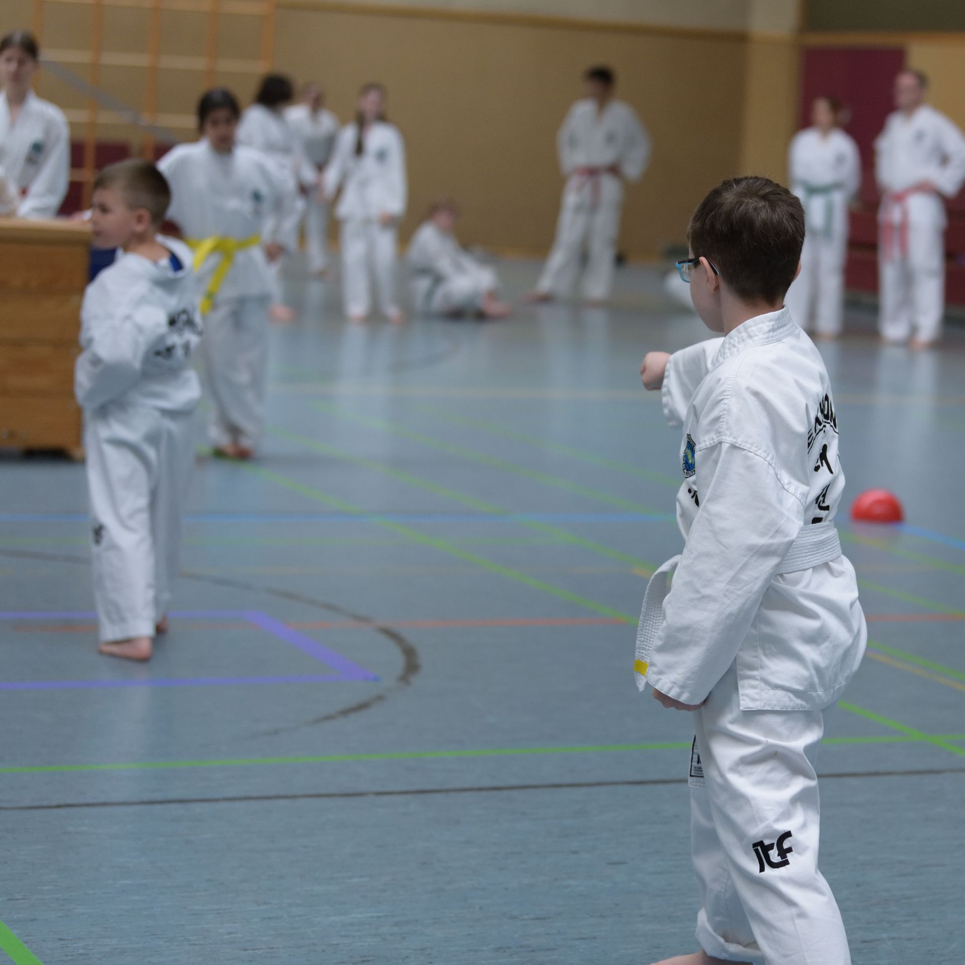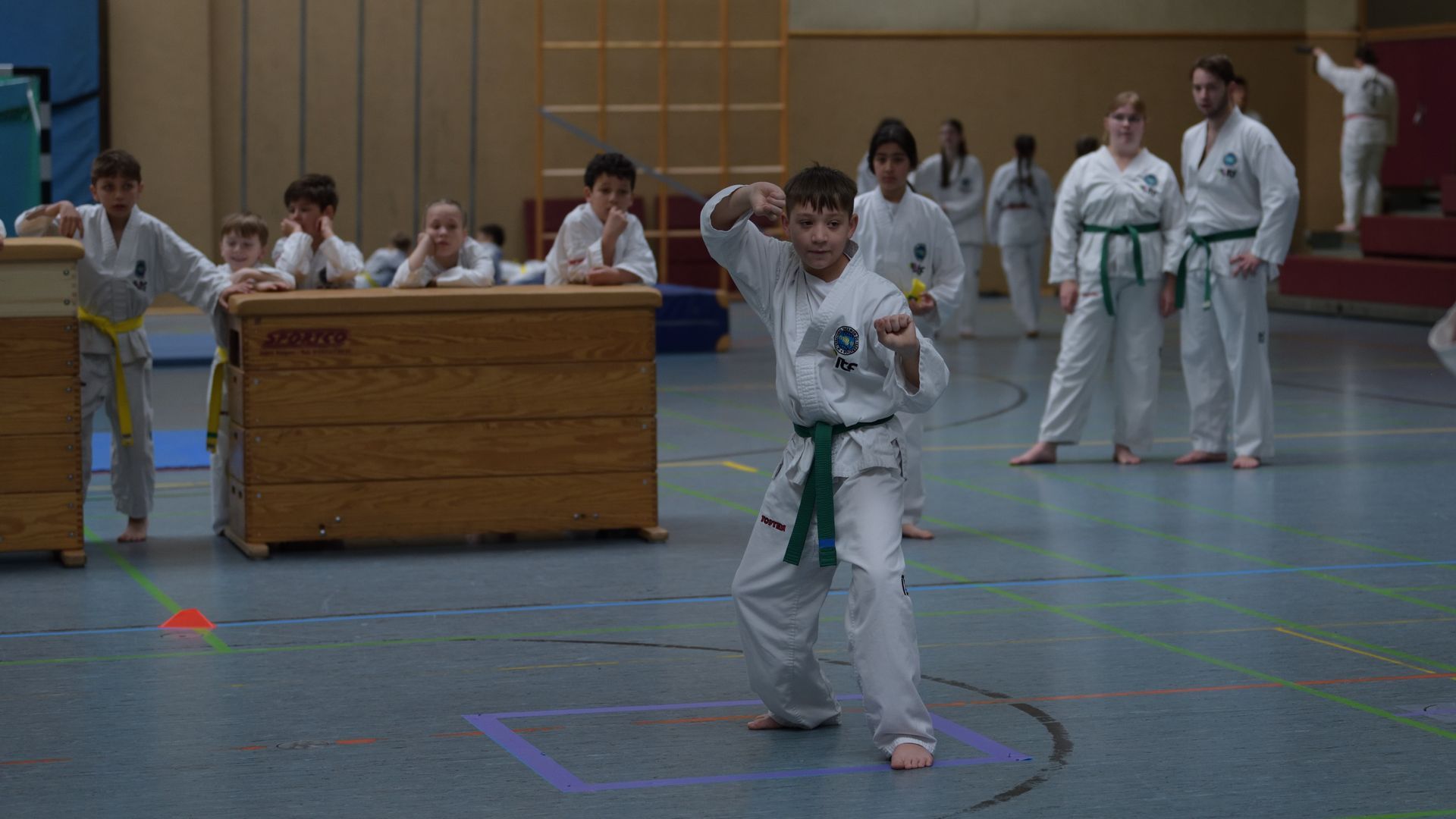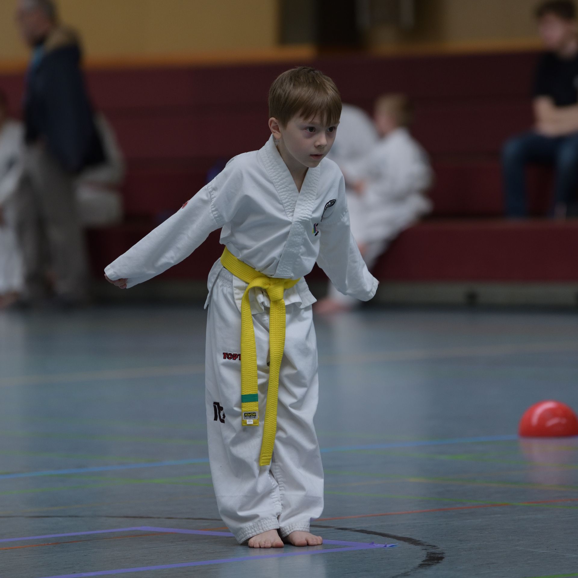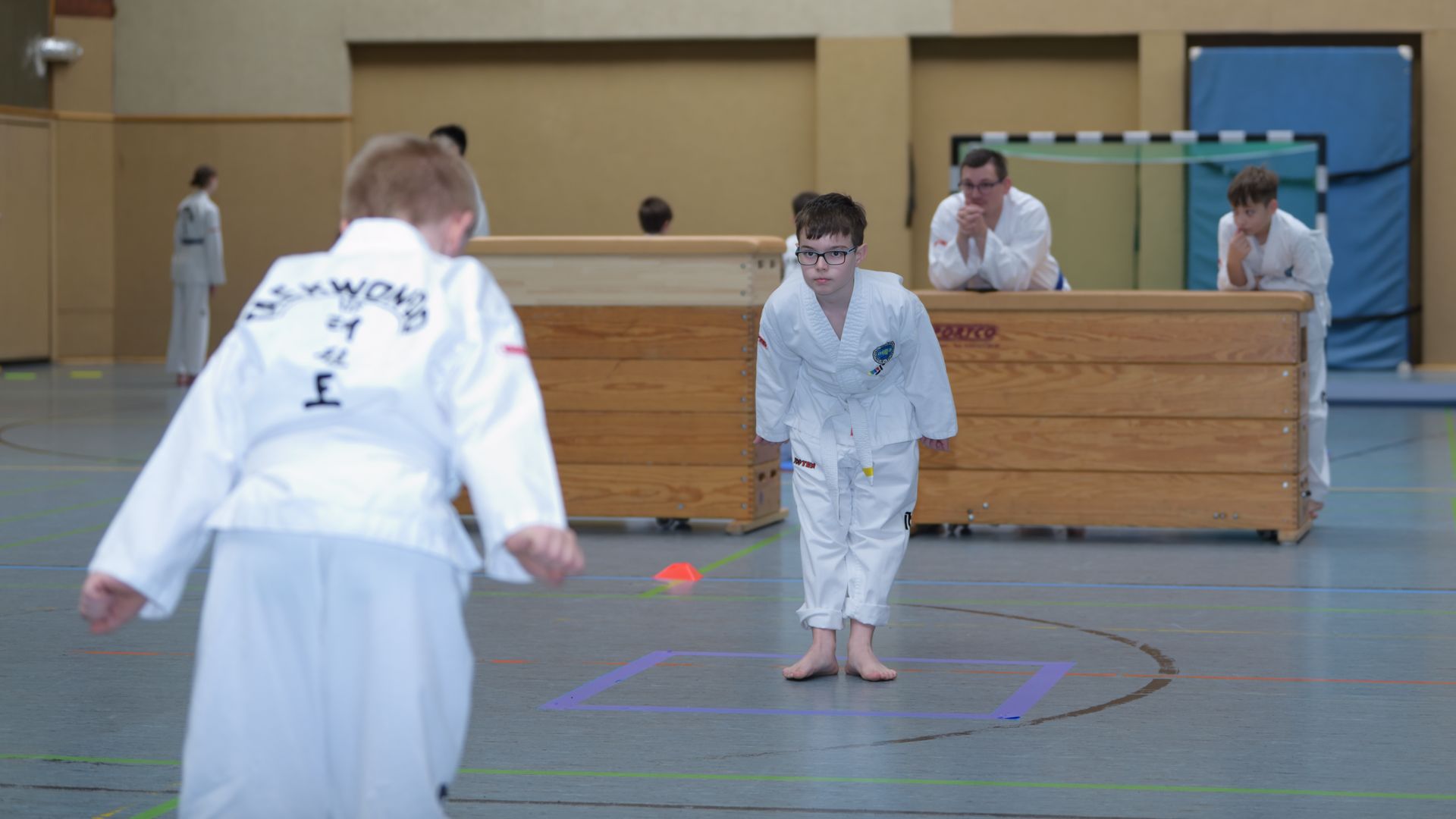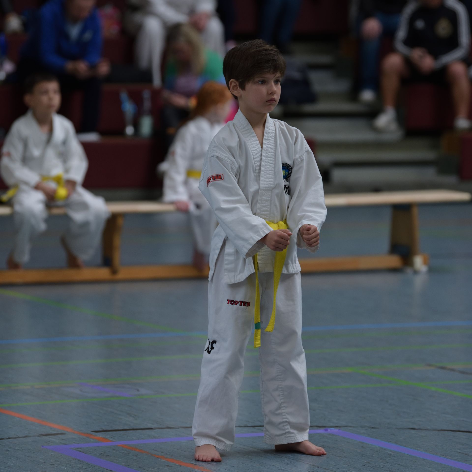 Nach gemeinsamem Angrüßen und kurzen Begrüßungsworten startete das Turnier in der Kategorie Formenlauf (Tul). Hier zeigten die Wettkämpfer*innen trotz mancher Nervösität gute Leistungen. Auch das Publikum, das größtenteils aus vielen Eltern, Großeltern, Geschwistern, Freunden und Bekannten bestand, sich von dem Können der Teilnehmer*innen überzeugen. Für viele der jüngeren Teilnehmer*innen war es zudem das erste Mal, bei dem sie unter "Wettkampfbedingungen" antraten.