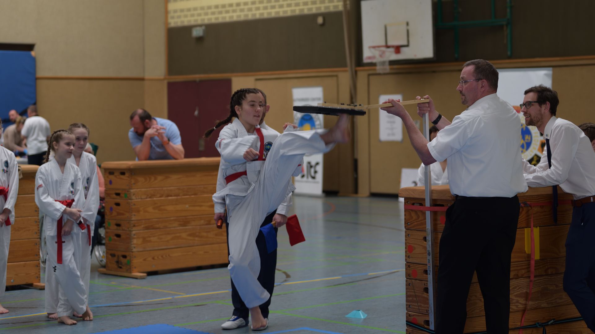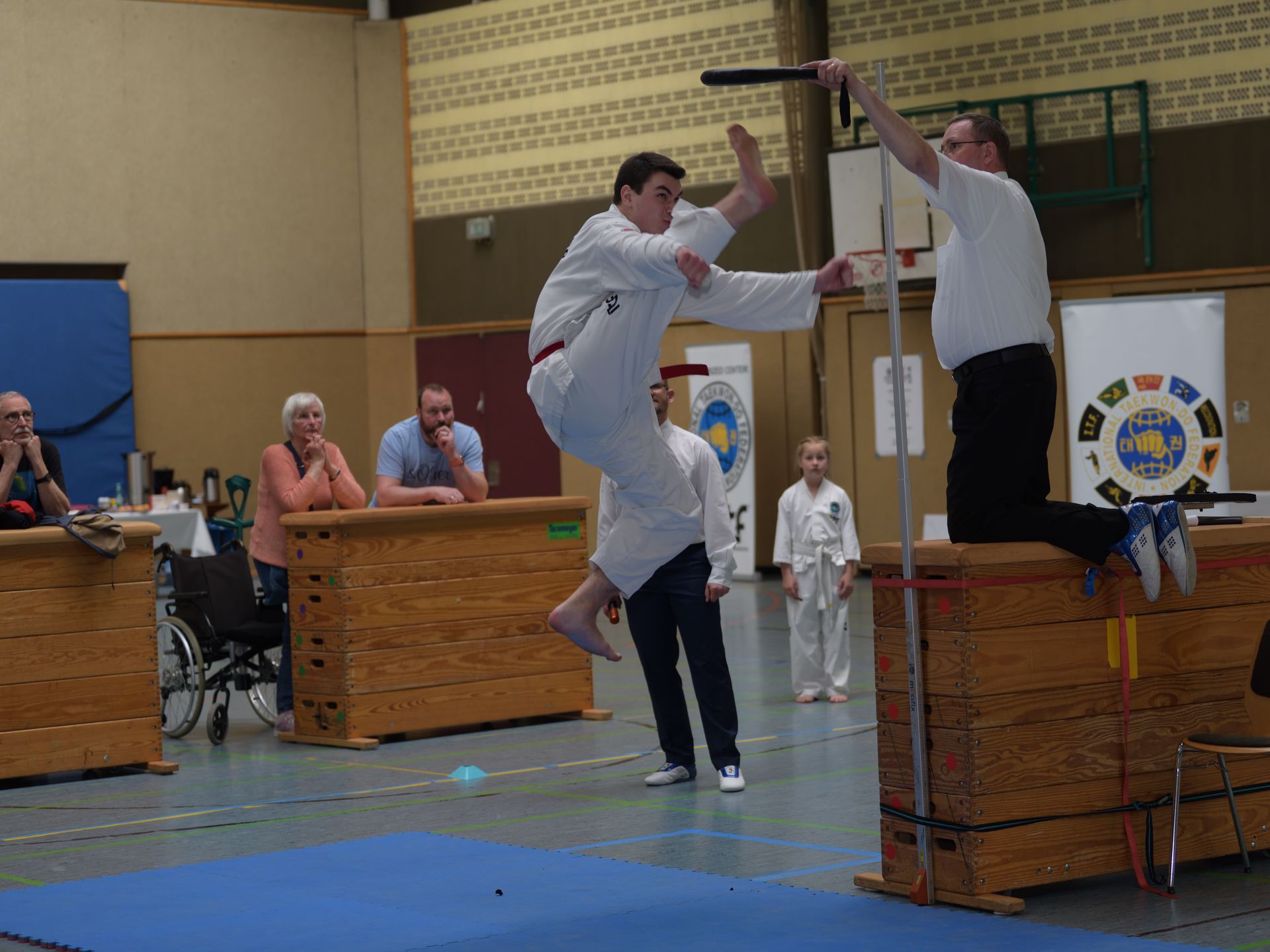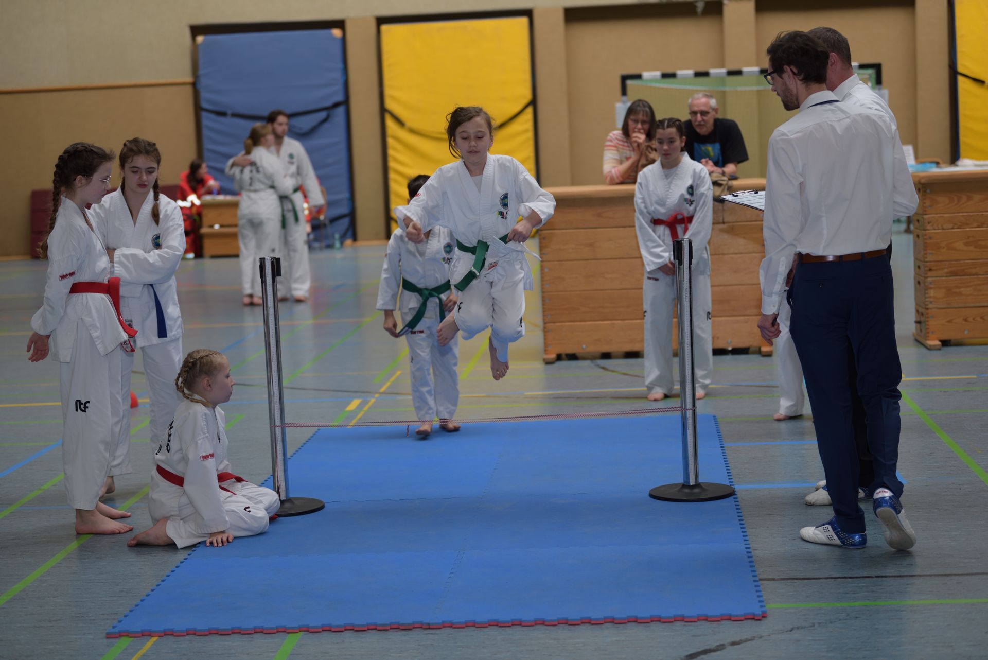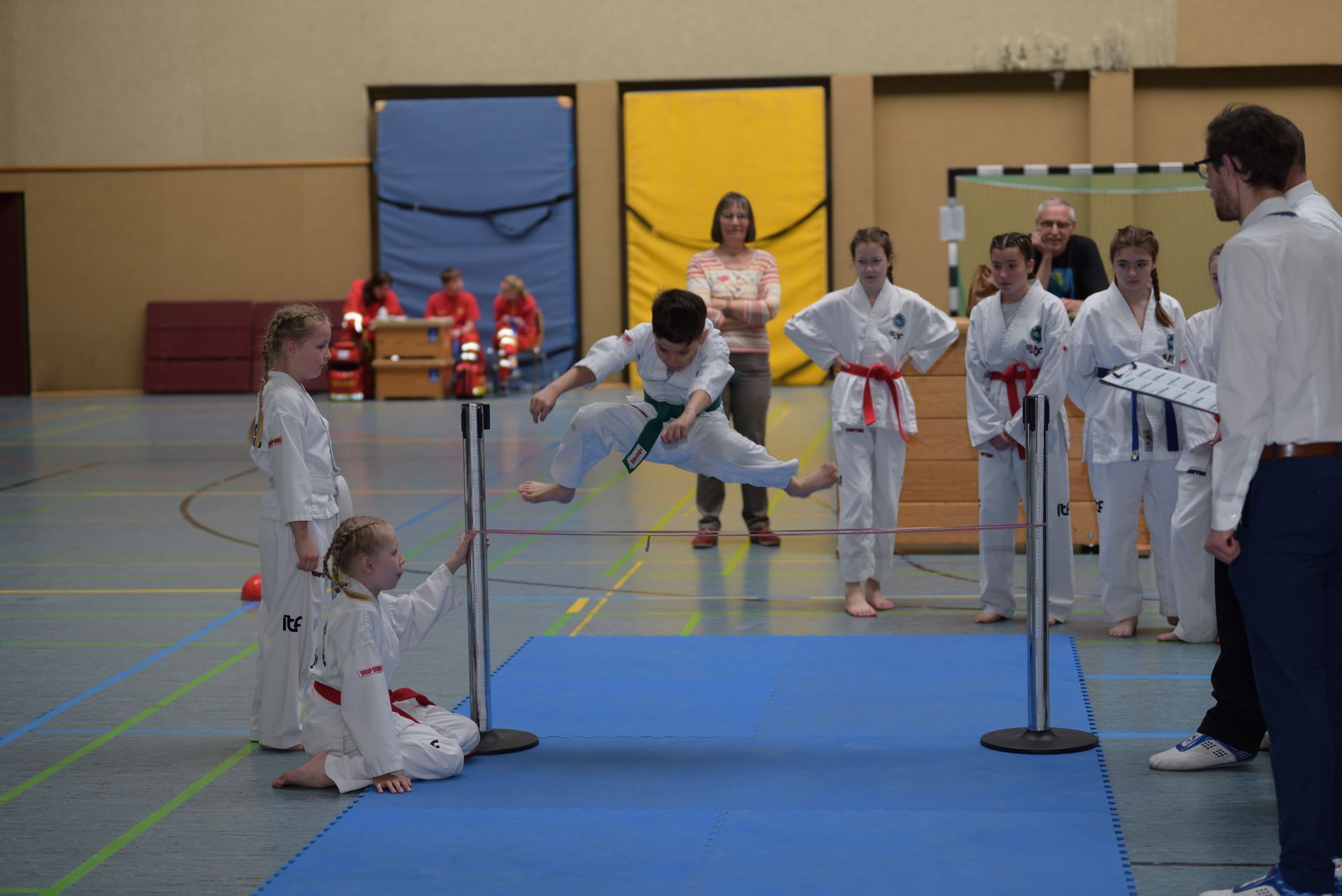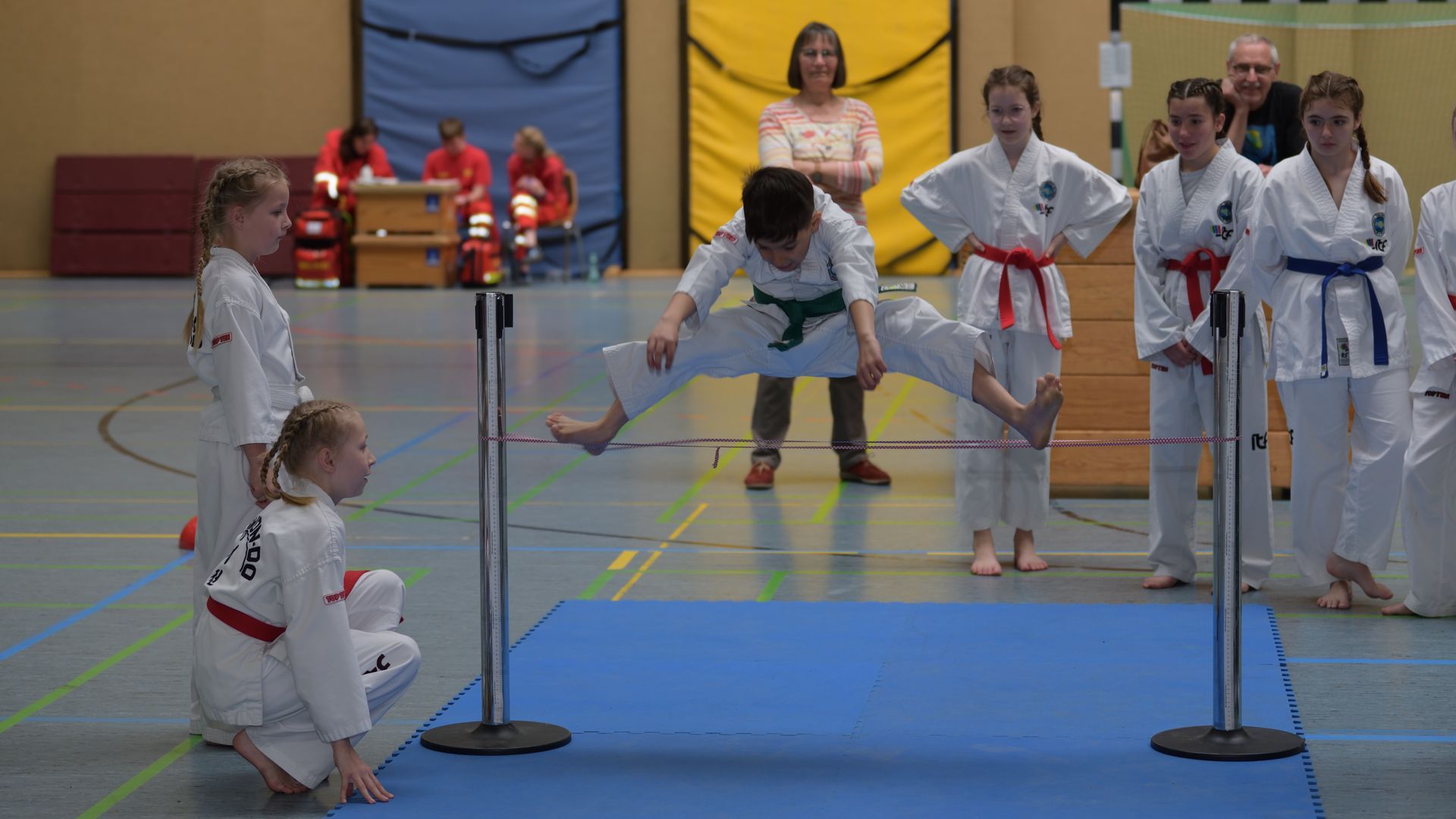 Die Spezialtechnik-Wettbewerbe sorgten wieder für Staunen beim Publikum. Während die jüngeren, niedrig graduierten Kinder sich im Hochsprung über ein Gummiseil maßen, mussten die älteren, fortgeschritteneren Sportler*innen mit dem Fuß ein von Runde zu Runde höher hängendes Brett treffen und möglichst umklappen. Die erreichten Höhen beeindruckten das Publikum. Ein paar der fortgeschritteneren Herren konnten sich gar fast an den internationalen Höhenstandard von über 2,40 m herantasten.