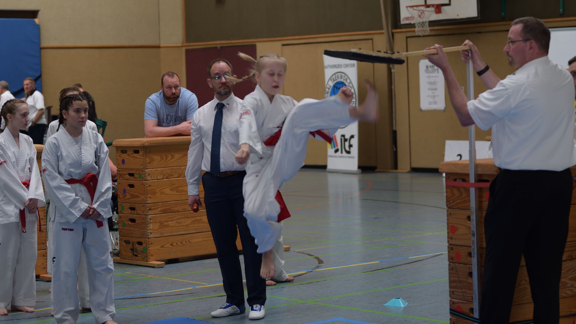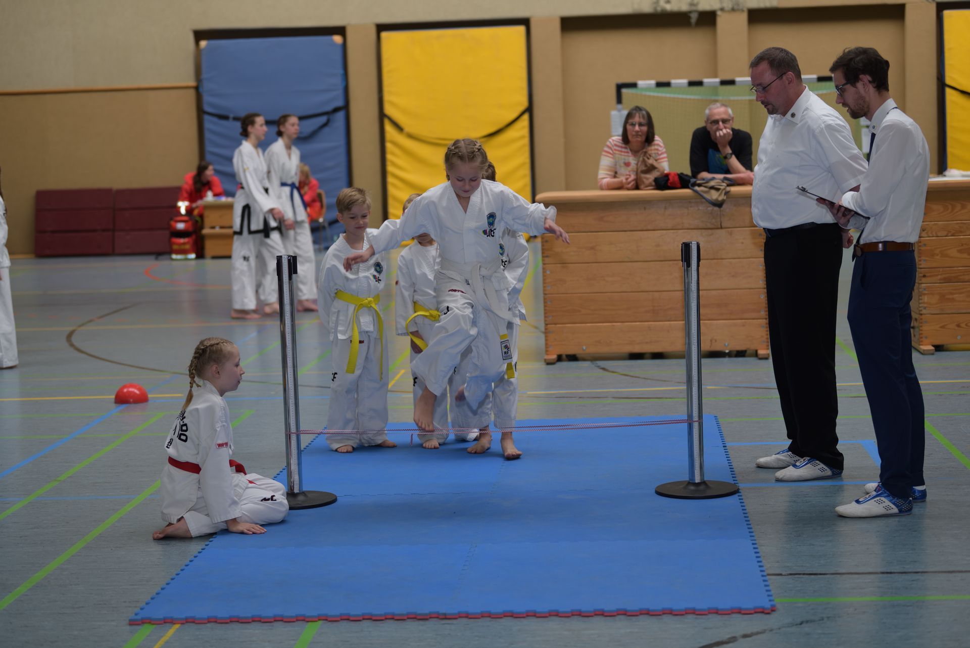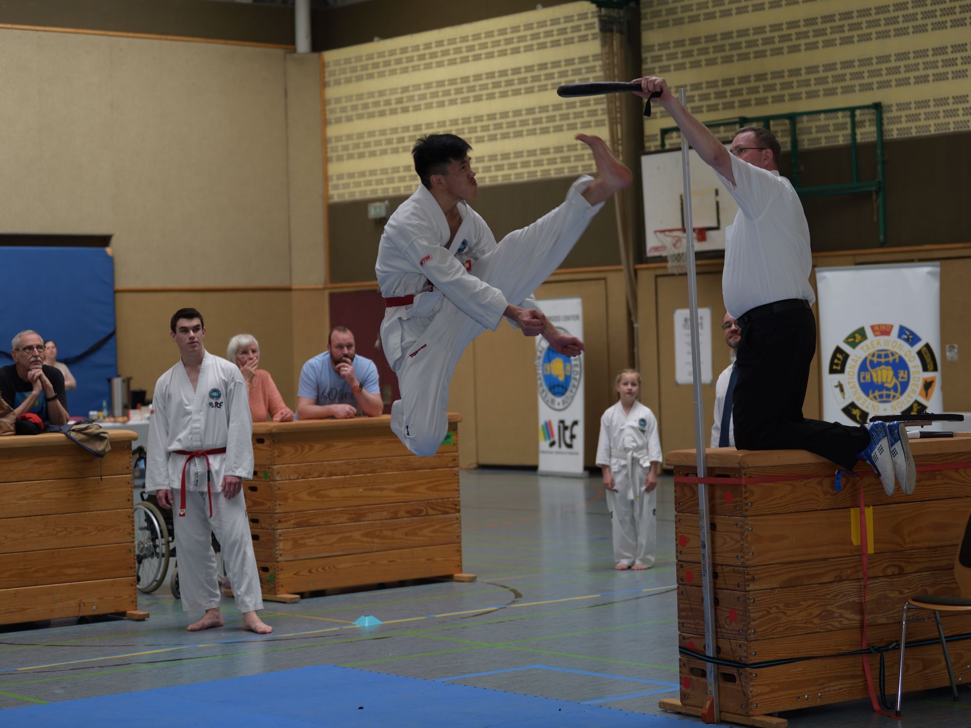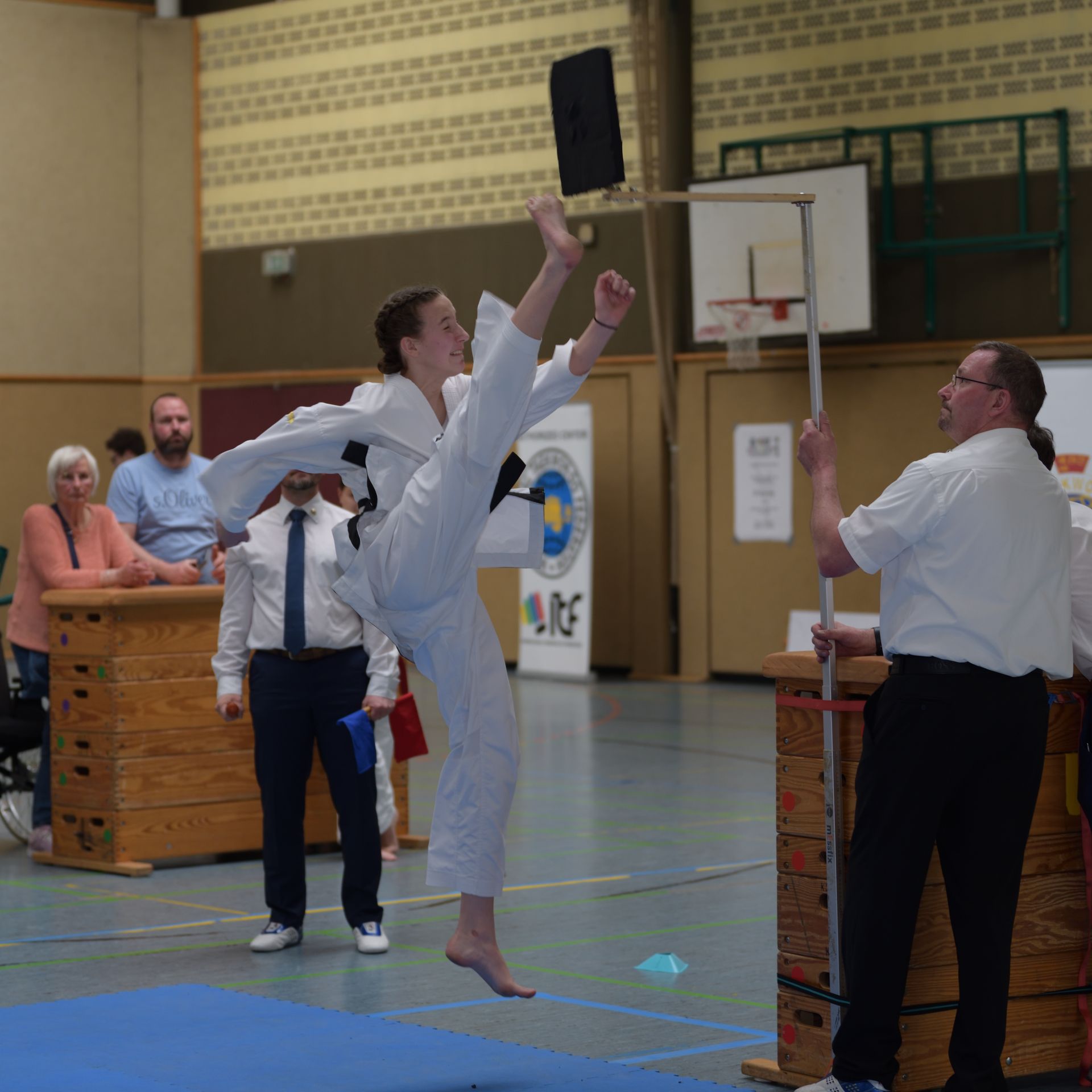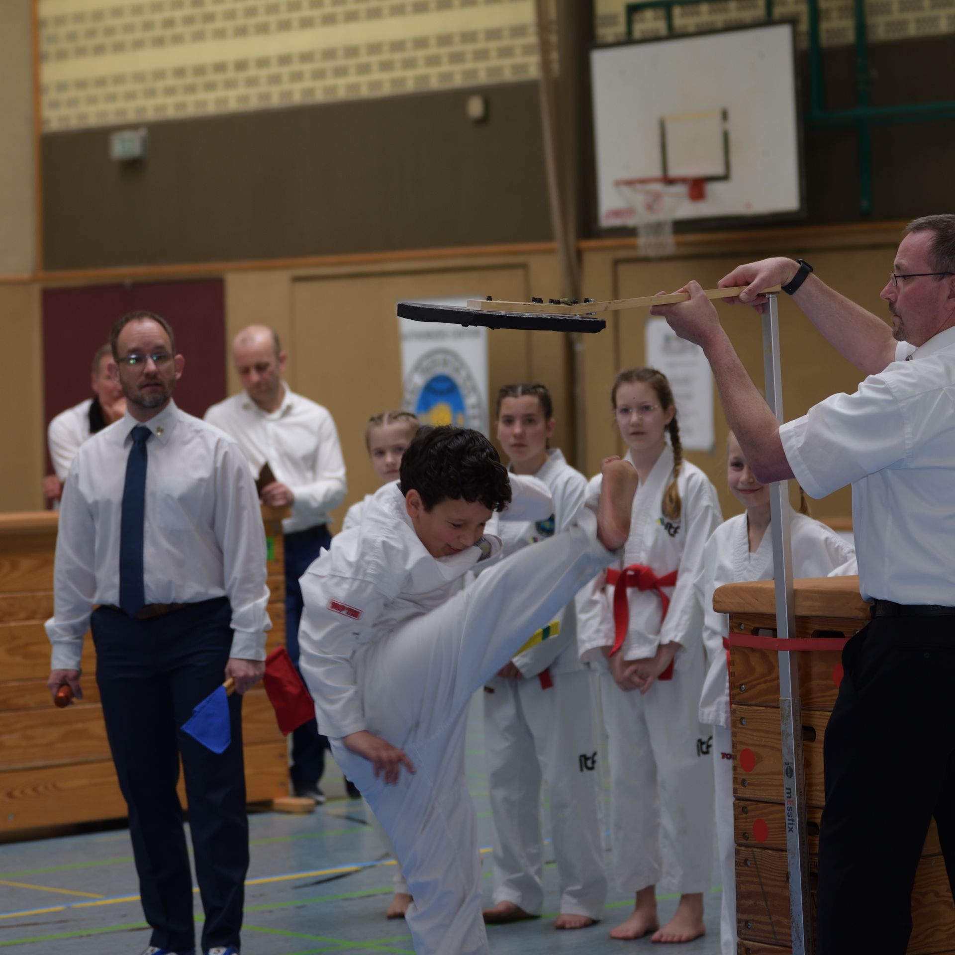 Die Spezialtechnik-Wettbewerbe sorgten wieder für Staunen beim Publikum. Während die jüngeren, niedrig graduierten Kinder sich im Hochsprung über ein Gummiseil maßen, mussten die älteren, fortgeschritteneren Sportler*innen mit dem Fuß ein von Runde zu Runde höher hängendes Brett treffen und möglichst umklappen. Die erreichten Höhen beeindruckten das Publikum. Ein paar der fortgeschritteneren Herren konnten sich gar fast an den internationalen Höhenstandard von über 2,40 m herantasten.