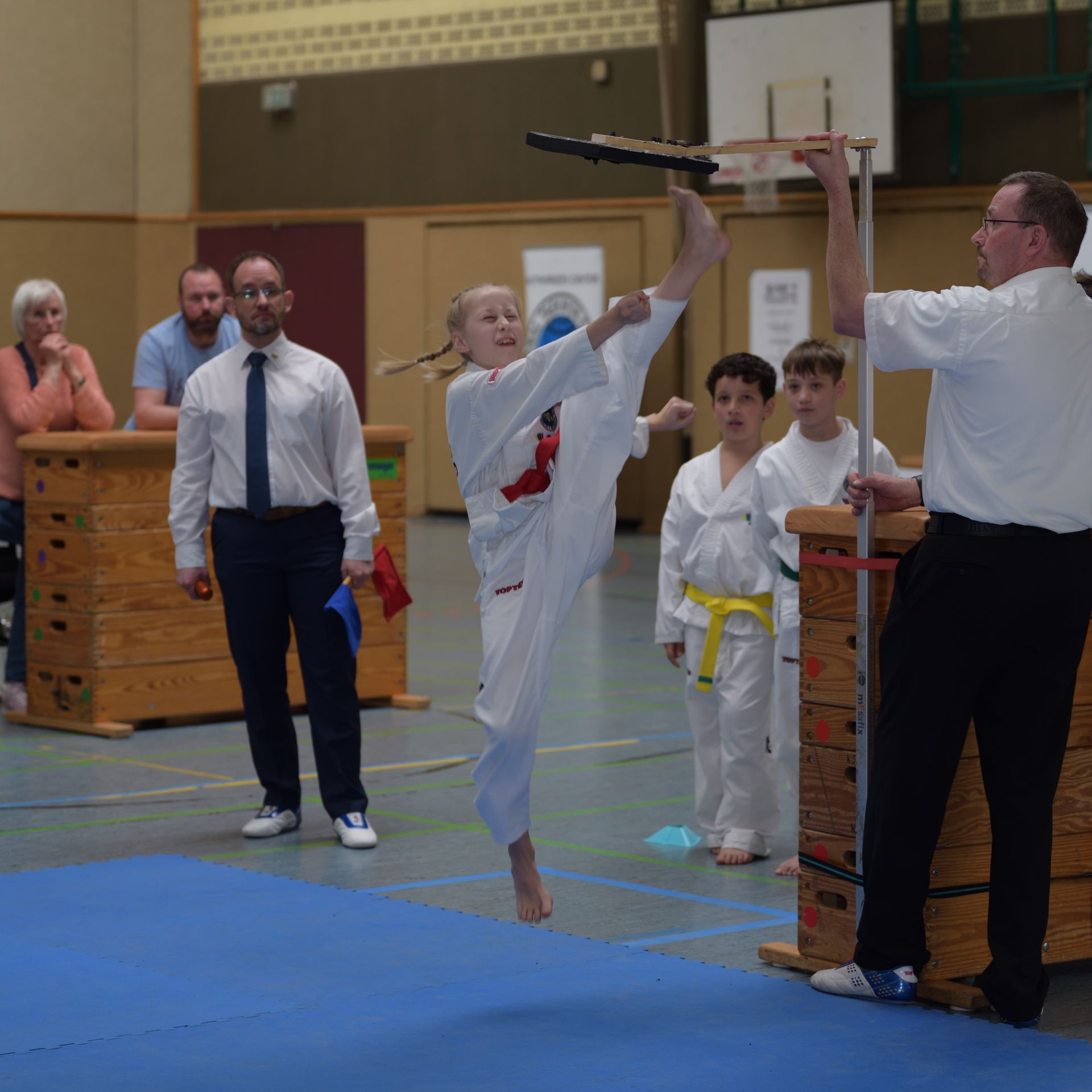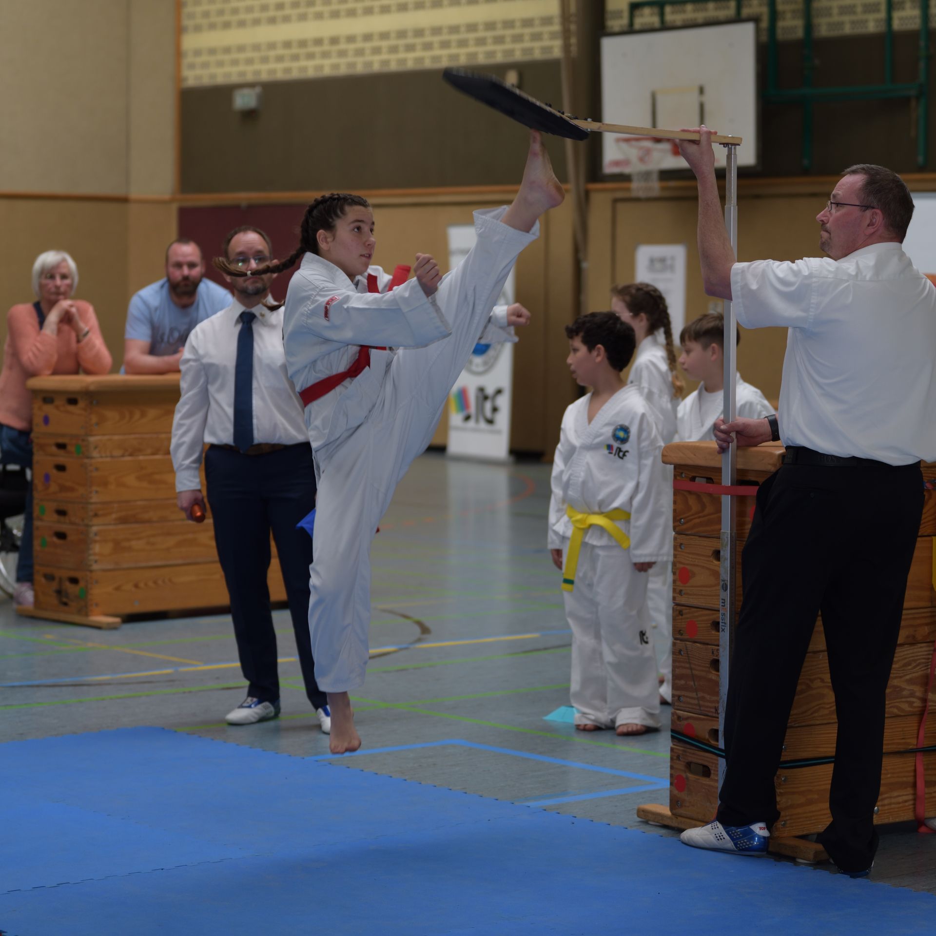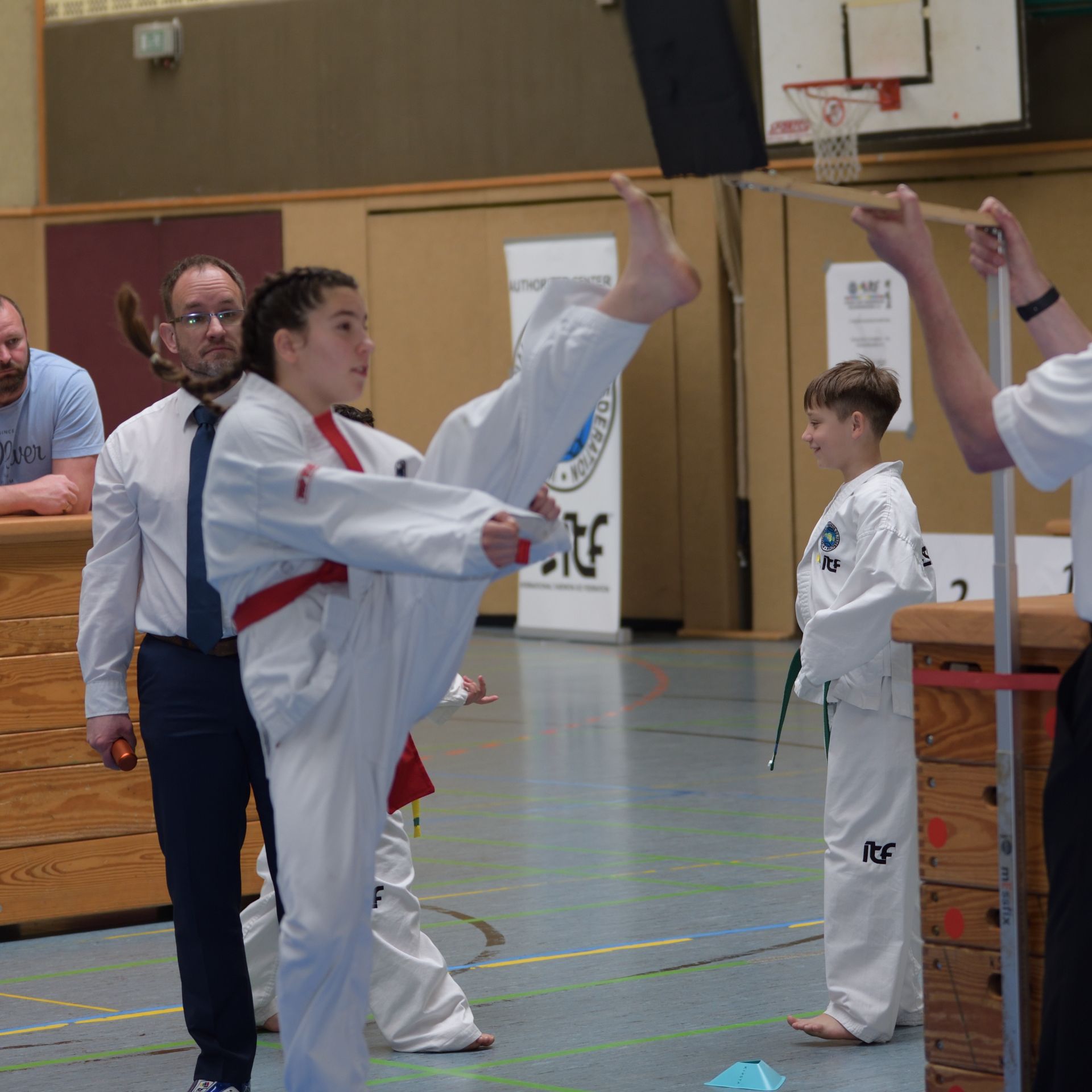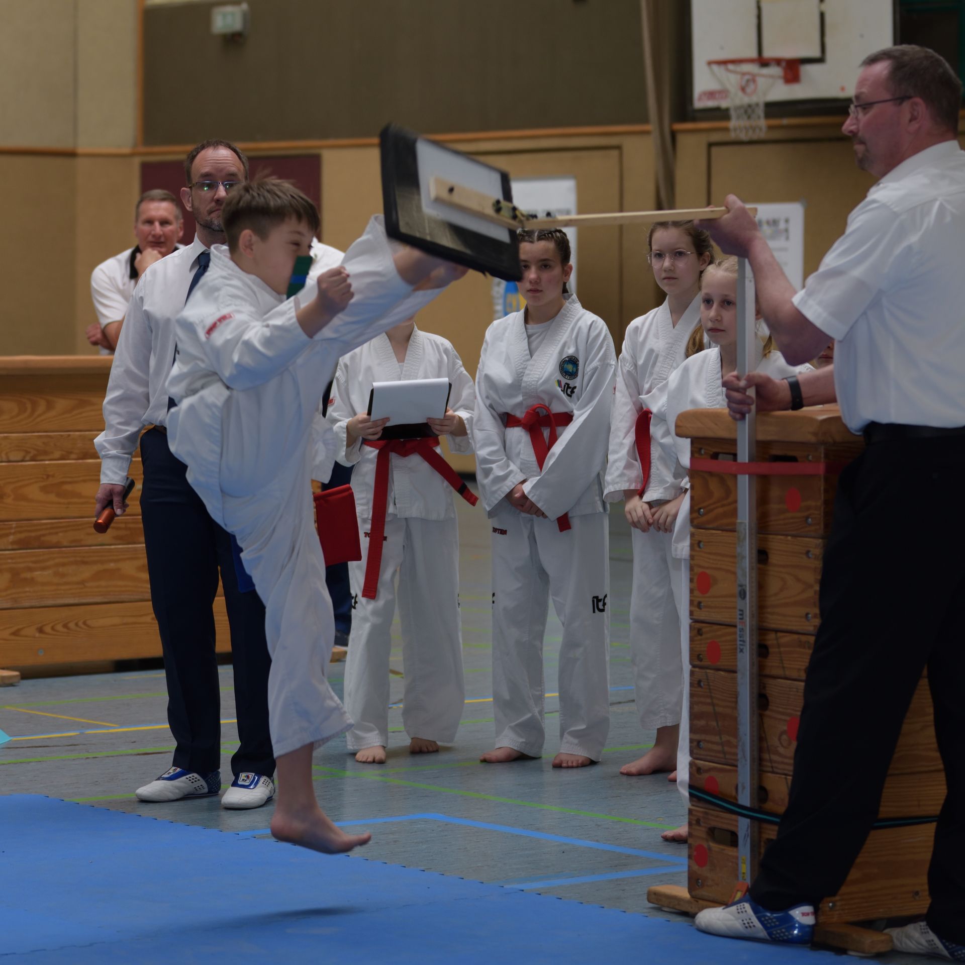 Die Spezialtechnik-Wettbewerbe sorgten wieder für Staunen beim Publikum. Während die jüngeren, niedrig graduierten Kinder sich im Hochsprung über ein Gummiseil maßen, mussten die älteren, fortgeschritteneren Sportler*innen mit dem Fuß ein von Runde zu Runde höher hängendes Brett treffen und möglichst umklappen. Die erreichten Höhen beeindruckten das Publikum. Ein paar der fortgeschritteneren Herren konnten sich gar fast an den internationalen Höhenstandard von über 2,40 m herantasten.