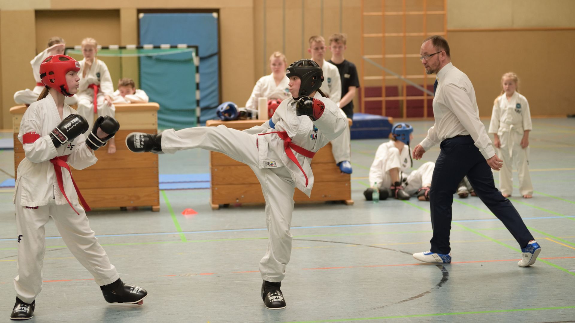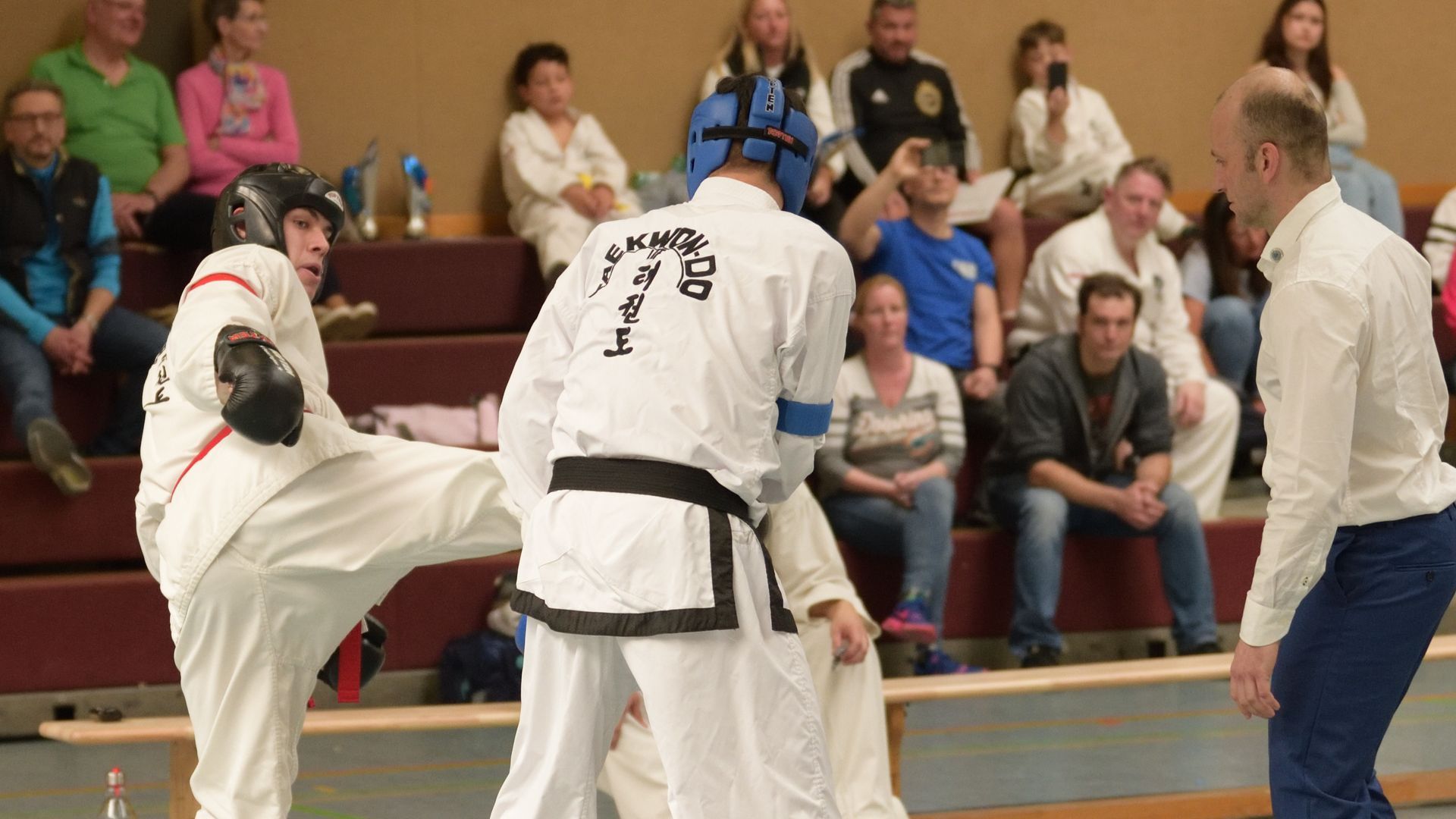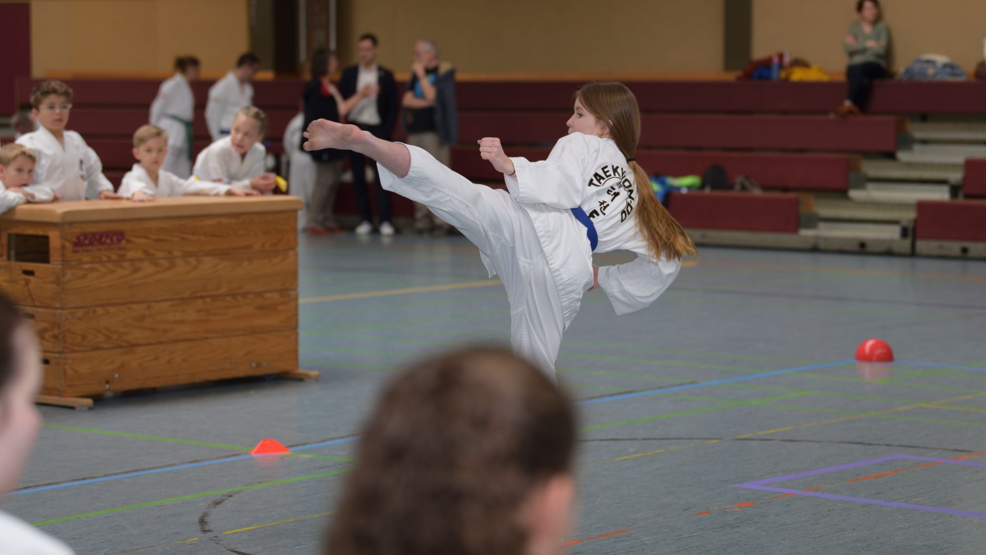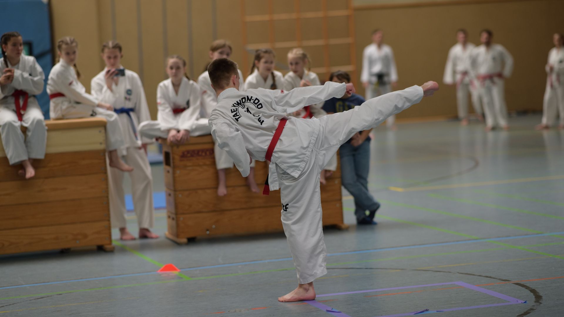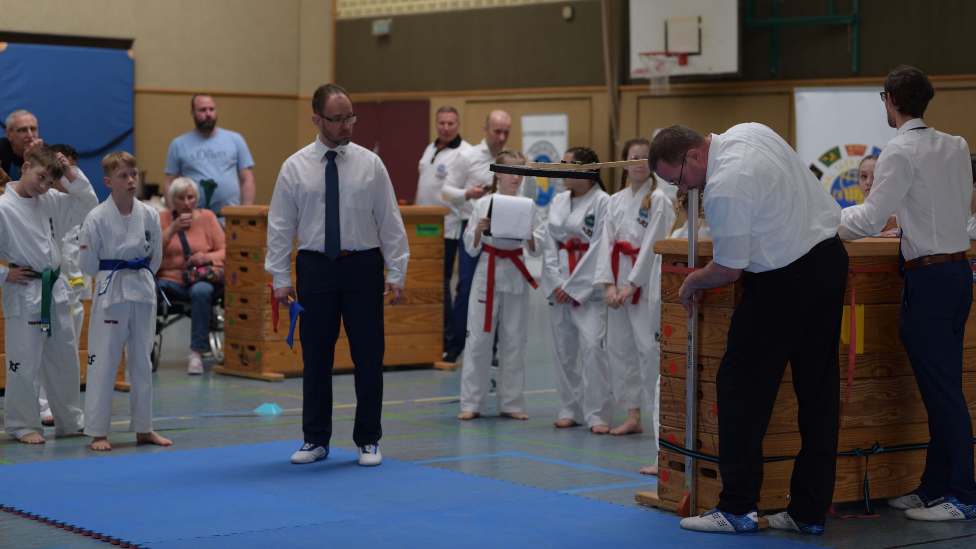 Die Spezialtechnik-Wettbewerbe sorgten wieder für Staunen beim Publikum. Während die jüngeren, niedrig graduierten Kinder sich im Hochsprung über ein Gummiseil maßen, mussten die älteren, fortgeschritteneren Sportler*innen mit dem Fuß ein von Runde zu Runde höher hängendes Brett treffen und möglichst umklappen. Die erreichten Höhen beeindruckten das Publikum. Ein paar der fortgeschritteneren Herren konnten sich gar fast an den internationalen Höhenstandard von über 2,40 m herantasten.