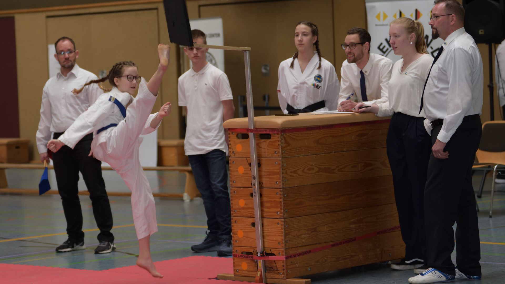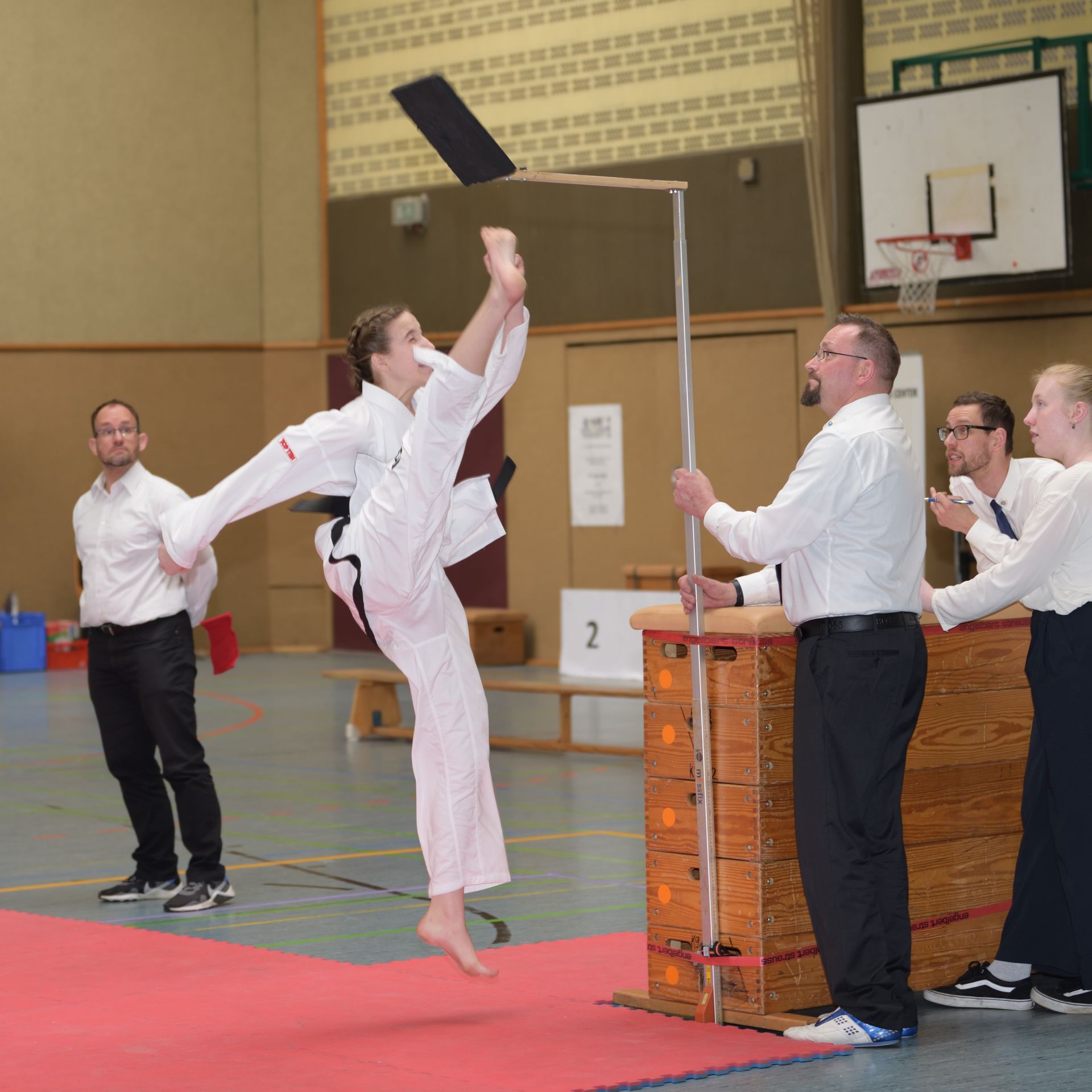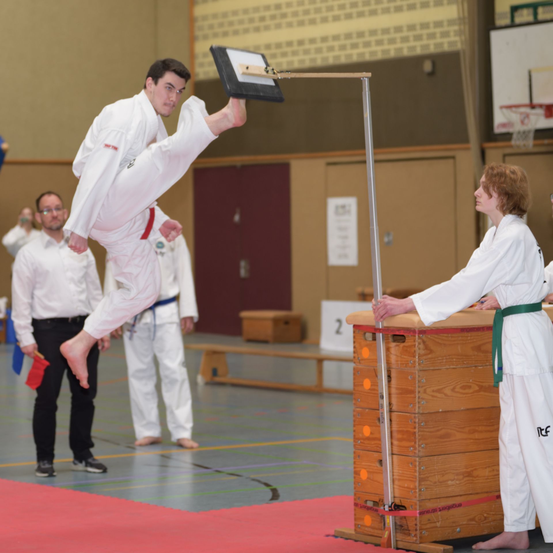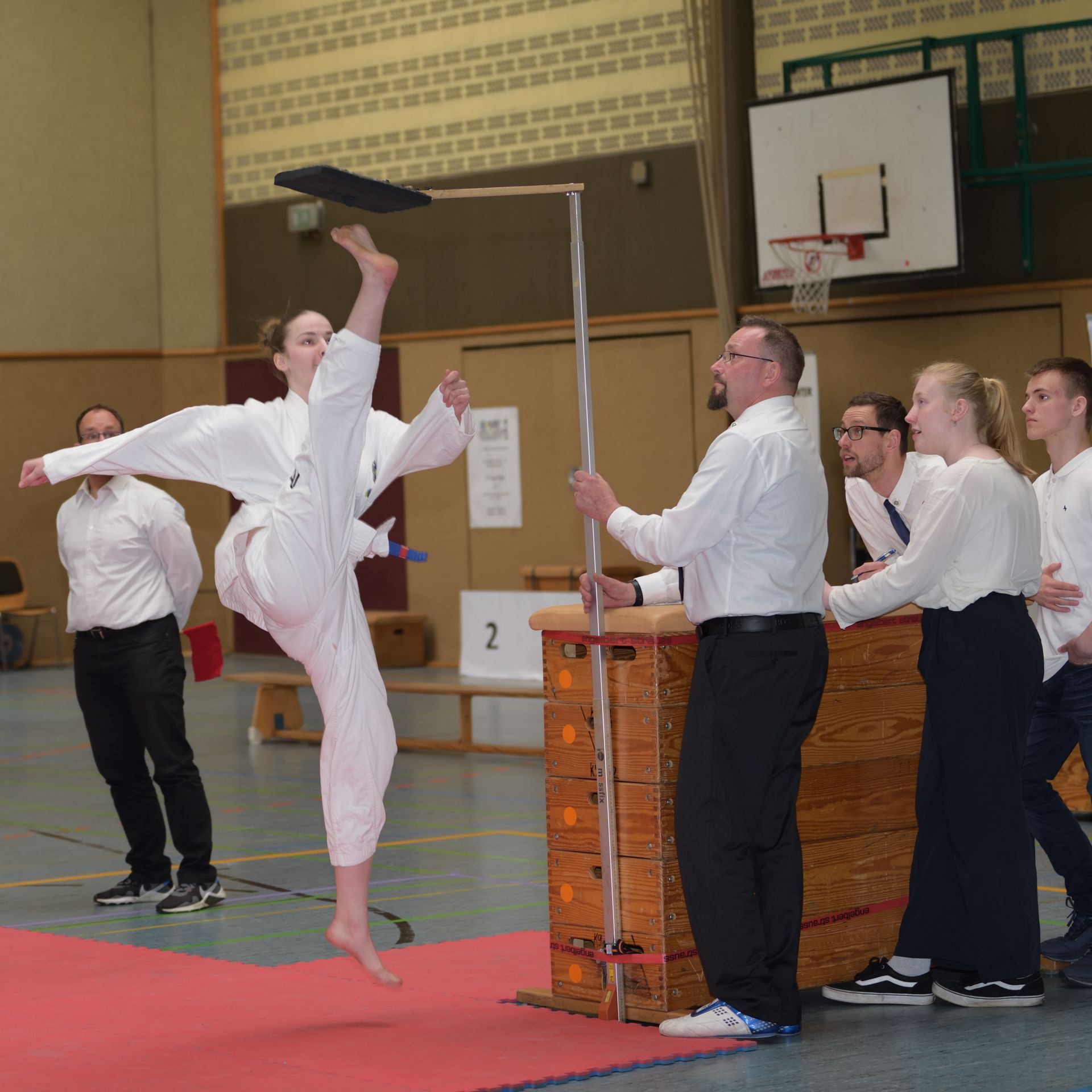 Die Spezialtechnik-Wettbewerbe fanden ebenfalls großen Anklang beim Publikum. Während die jüngeren, niedrig graduierten Kinder sich im Hochsprung über ein Gummiseil maßen, mussten die älteren, fortgeschritteneren Sportler*innen mit dem Fuß ein von Runde zu Runde höher hängendes Brett treffen und möglichst umklappen. Die hierbei teilweise erreichten höhen sorgten beim Publikum für Staunen und Beifall.