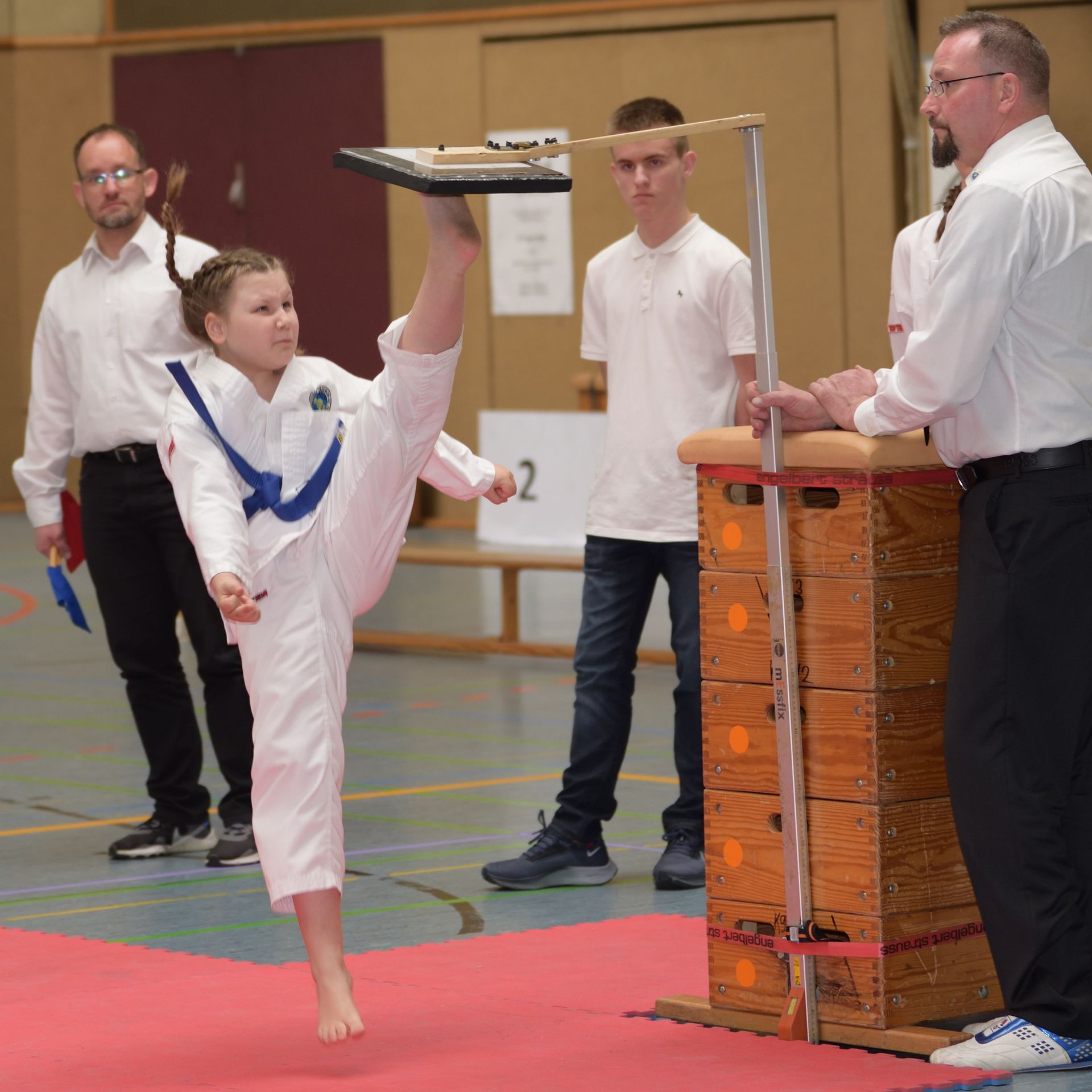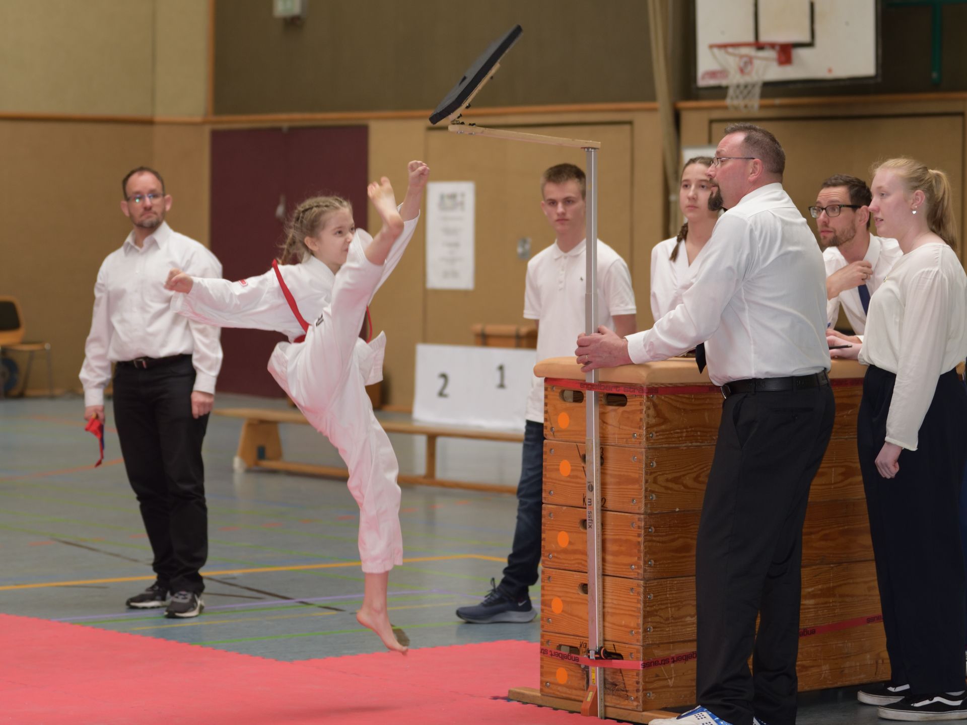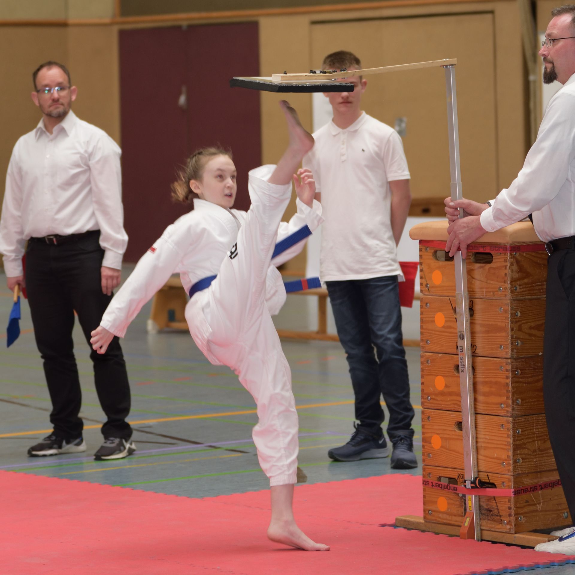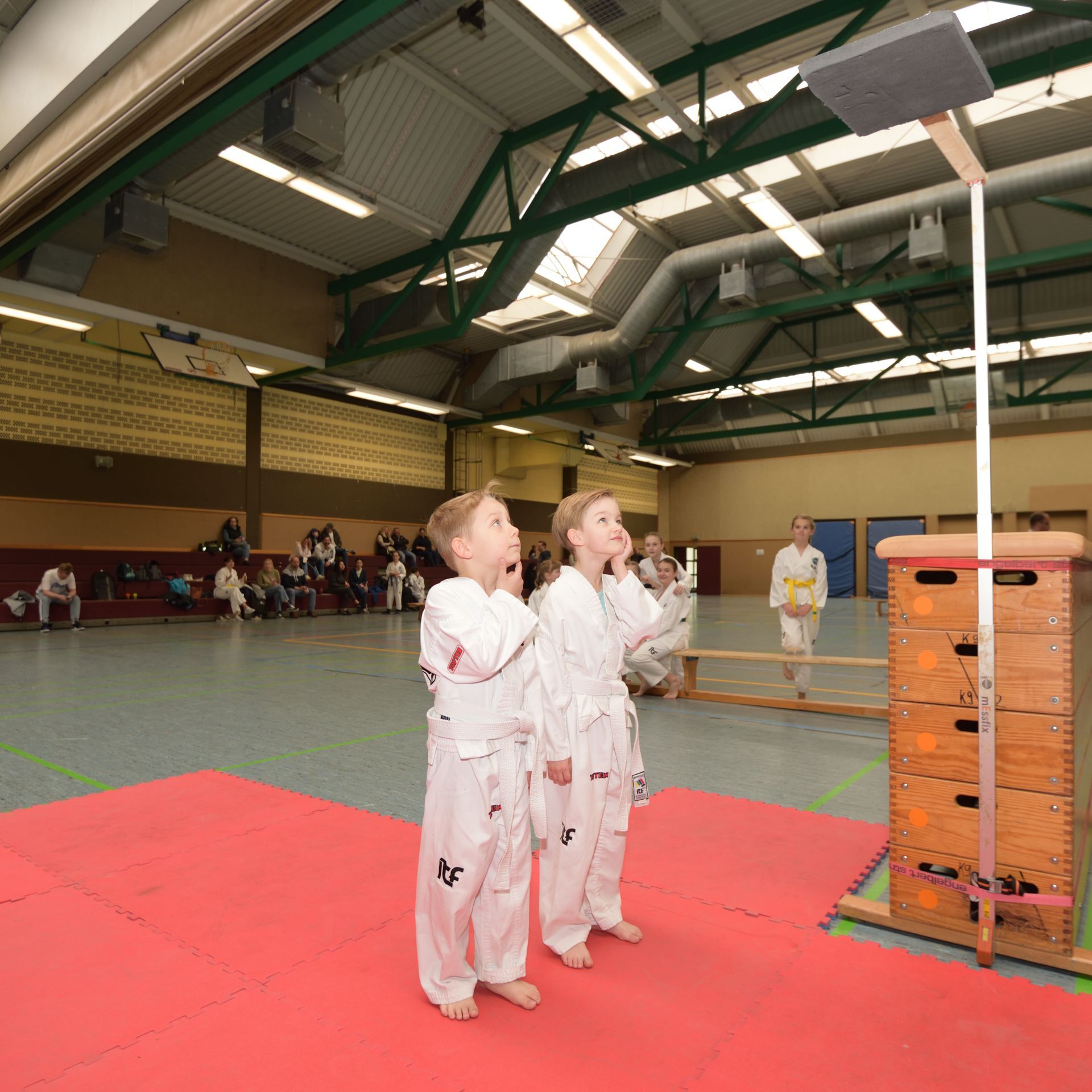 Die Spezialtechnik-Wettbewerbe fanden ebenfalls großen Anklang beim Publikum. Während die jüngeren, niedrig graduierten Kinder sich im Hochsprung über ein Gummiseil maßen, mussten die älteren, fortgeschritteneren Sportler*innen mit dem Fuß ein von Runde zu Runde höher hängendes Brett treffen und möglichst umklappen. Die hierbei teilweise erreichten höhen sorgten beim Publikum für Staunen und Beifall.